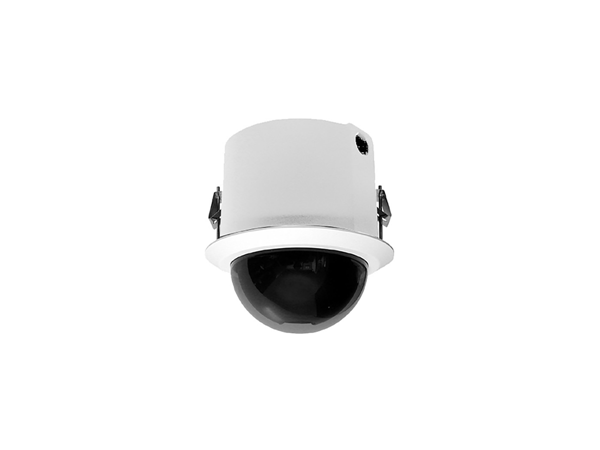 The white Spectra Enhanced S6230-FWL0 1080p PTZ Network In-Ceiling Dome Camera from Pelco supports video at resolutions of up to 1920 x 1080 at 60 fps. It features a mechanical IR cut filter for night vision. This camera has a 4.3-129mm varifocal lens with an aperture of f/1.6-4.7 and a 59.5 to 2.1°horizontal field of view. It supports microSD cards up to 32GB for onboard storage. This camera can be powered via PoE+ or by using a power supply (available separately).