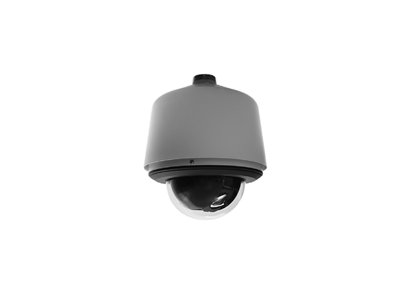 The gray Spectra Enhanced 1080p 30x PTZ Outdoor Network Stainless Steel Pendant Dome Camera from Pelco includes a back box and a clear lower dome. It captures video with a wide dynamic range (WDR) imaging system at up to 60 fps and has various features that include image defog and Pelco's full suite of behavioral analytics. It also features SureVision 3.0 for low-light performance.